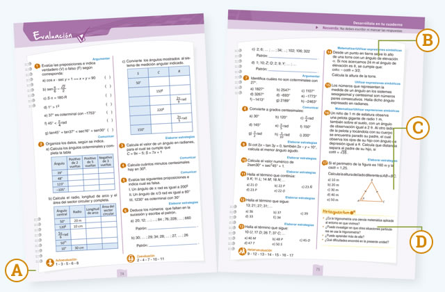 Diversos tipos de actividades que evalúan el aprendizaje de cada Unidad, teniendo en cuenta las capacidades matemáticas propuestas en el nuevo Marco Curricular Nacional.