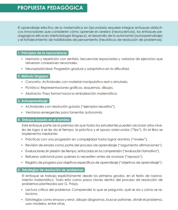 El aprendizaje efectivo de la matemática en Secundaria requiere integrar enfoques didácticos innovadores que consideren cómo aprende el cerebro (neurociencia), los enfoques pedagógicos effcaces (Metodología Singapur), el desarrollo de la autonomía (autoaprendizaje) y el fortalecimiento de habilidades de pensamiento (heurísticas de resolución de problemas).